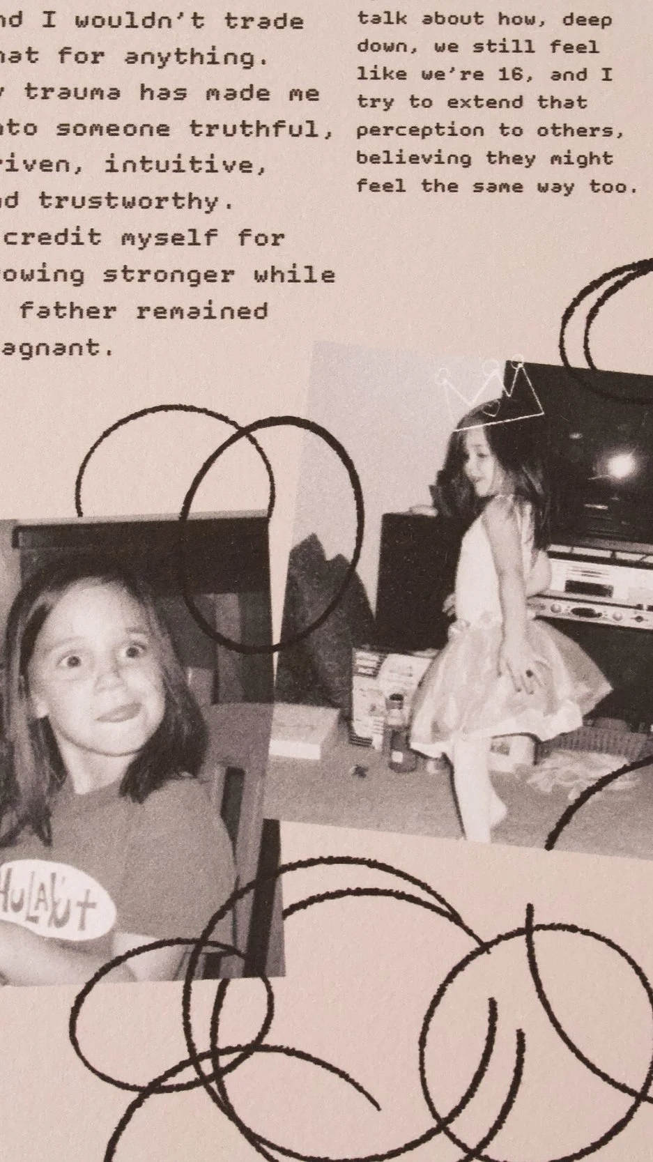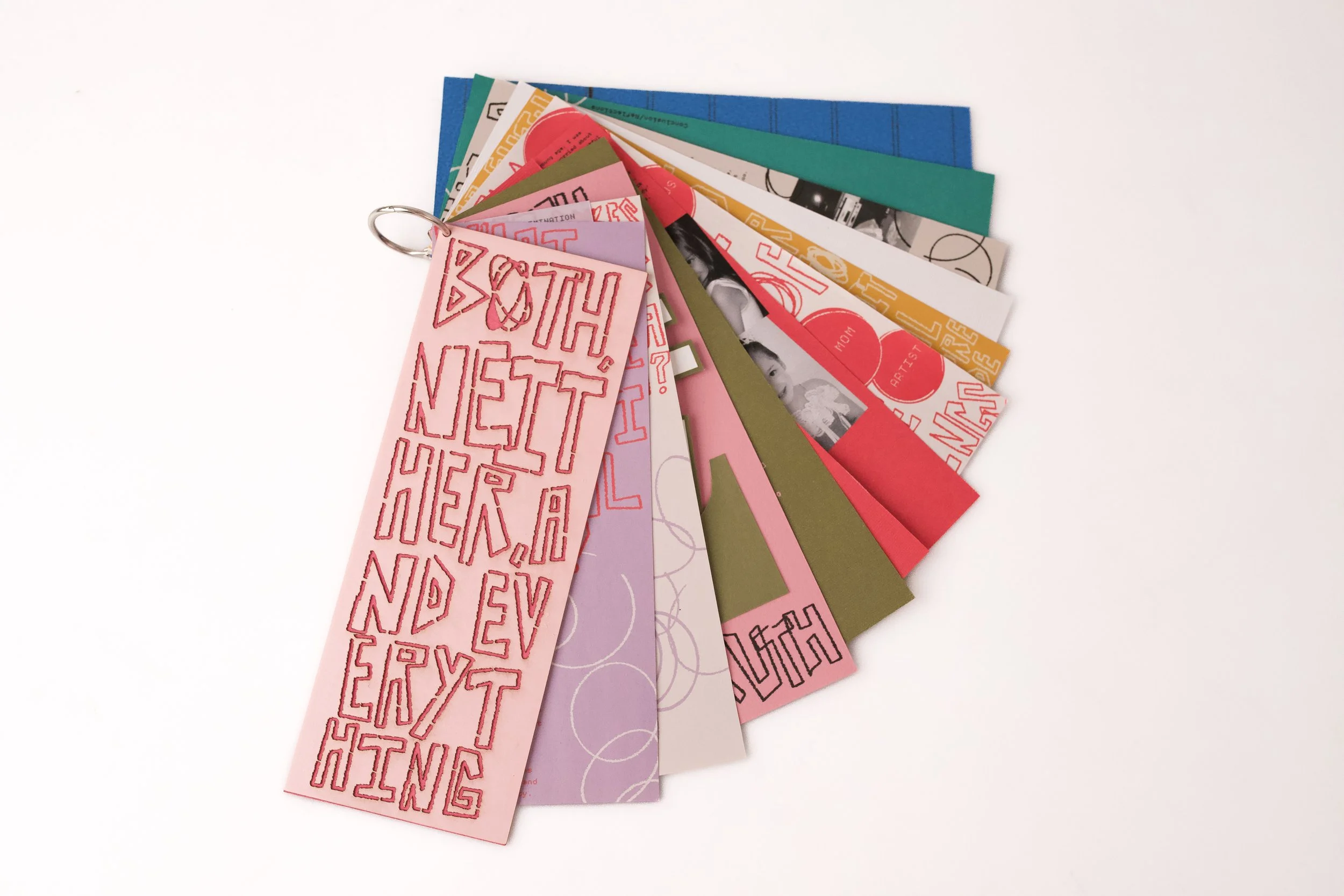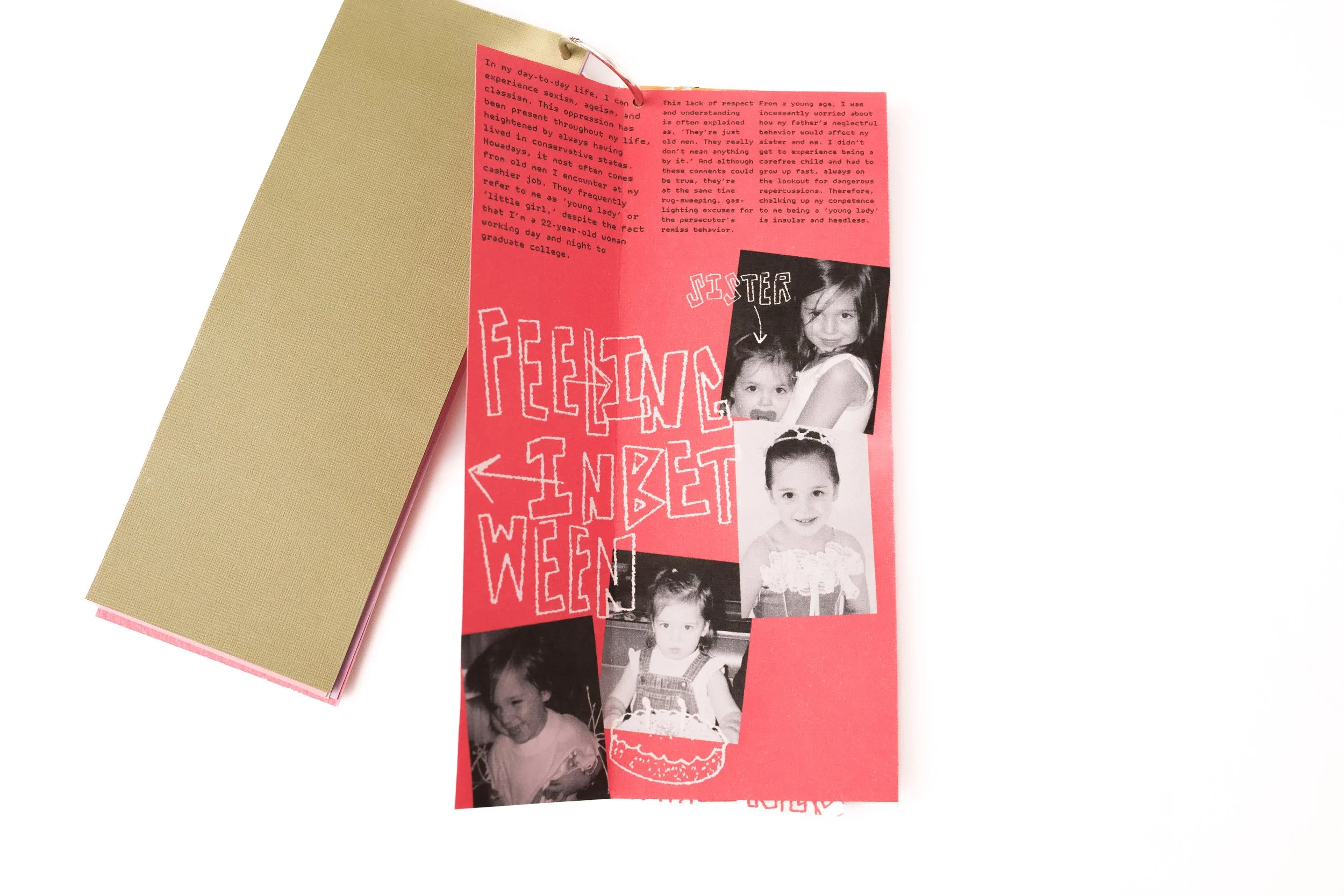 This zine tangibly personifies how it feels to recount my personal experiences with intersectionality. The stacked page format and the concentric O’s represents the layered nature of this analytical framework. Eight different types of paper and laser cutting techniques were also used to physically reinforce this idea of interconnectedness.