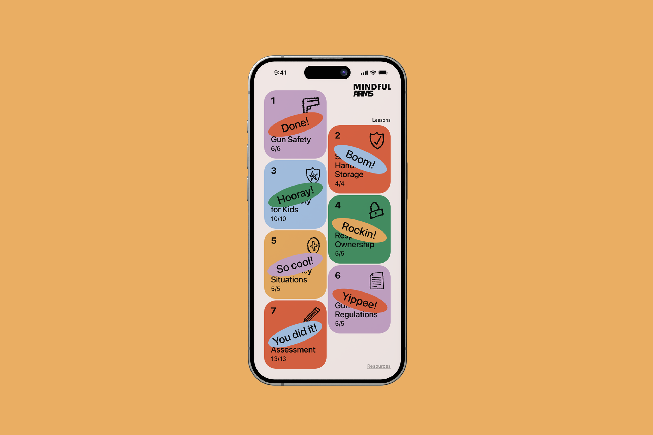 With a desire to prevent increasing firearm tragedies, this app is designed to educate both children and adults about gun safety. The wordmark mirrors a firearm, a deliberate reminder of the subject at hand. At its core, Mindful Arms is about intervention: interrupting generational cycles of ignorance with statistics, empathy, and a direct confrontation of the cultural normalization of gun ownership in the United States.