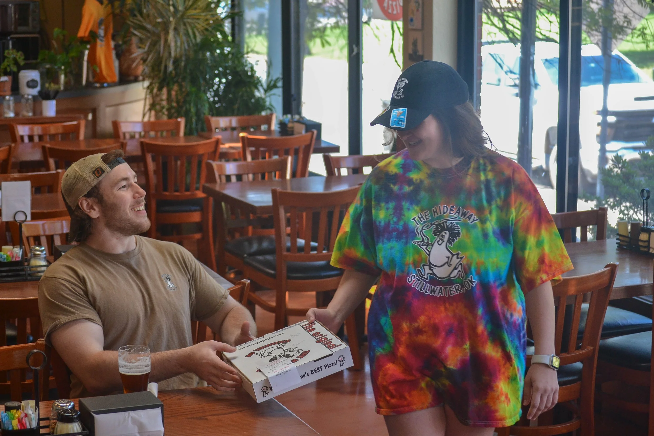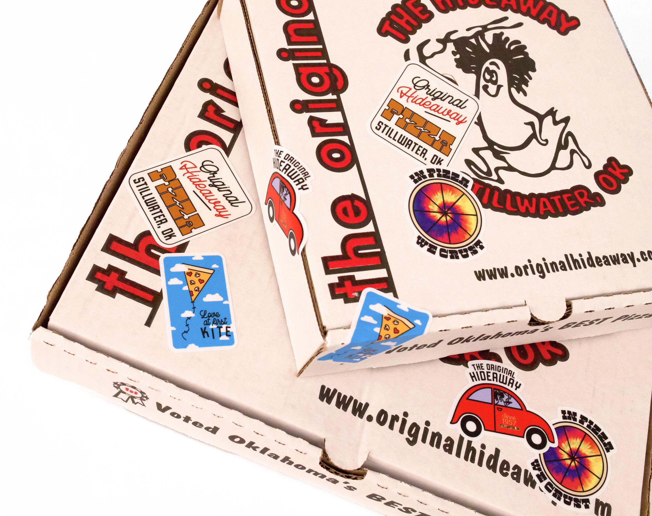 The Original Hideaway in Stillwater, OK, has been a beloved staple since 1957, famous for its scrumptious pizza. As one of Oklahoma's oldest delivery services, Hideaway Pizza once used a fleet of colorful Volkswagen Bugs for deliveries. The owners, the Dermers, are passionate about kites and tie-dye t-shirts—all of which inspired the design of these four nostalgic stickers which celebrate both longtime fans and first-time visitors.